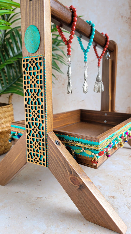 Wooden Islamic Arc Two-Faced Ramadan Calendar and Eid Mubarak with Tasbih Prayer Beads